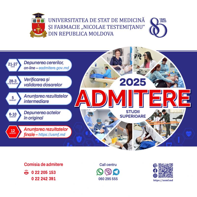 Pentru informații cu privire la oferta educațională a Universității, Regulamentul de admitere la USMF „Nicolae Testemițanu”, acte necesare și răspunsuri la întrebări frecvente, accesați: https://admitere.usmf.md/ro/admitere/studii-universitare/candidati-autohtoni