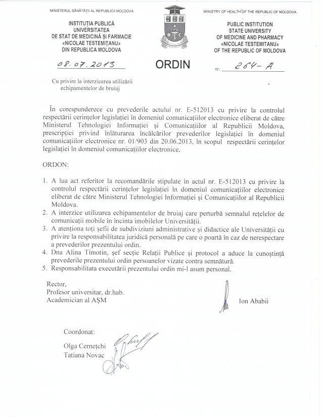 Potrivit actului nr. E-512013 eliberat de Ministerul Tehnologiei Informaţiei şi Comunicaţiilor, utilizarea echipamentelor de bruiaj contravine legislației RM.În vederea respectării prevederilor actului menționat, rectorul Universității de Stat de Medicină și Farmacie ”Nicolae Testemiţanu”, dl Ion Ababii, a emis Ordinul nr. 264–A, conform căruia se interzice utilizarea echipamentelor care perturbă semnalul reţelelor de comunicaţii mobile în incinta instituției. Şefii de subdiviziuni administrative şi didactice ale Universităţii poartă responsabilitate juridică şi personală în caz de nerespectare a prevederilor prezentului Ordin.